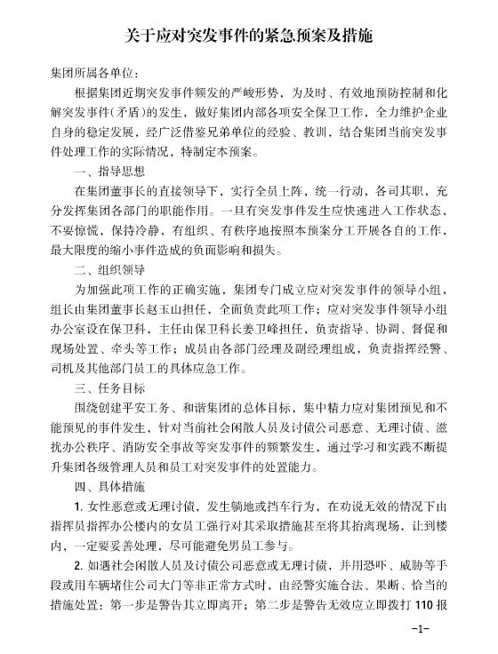 工务集团(企管)字【2014】40号《关于应对突发事件的紧急预案及措施》